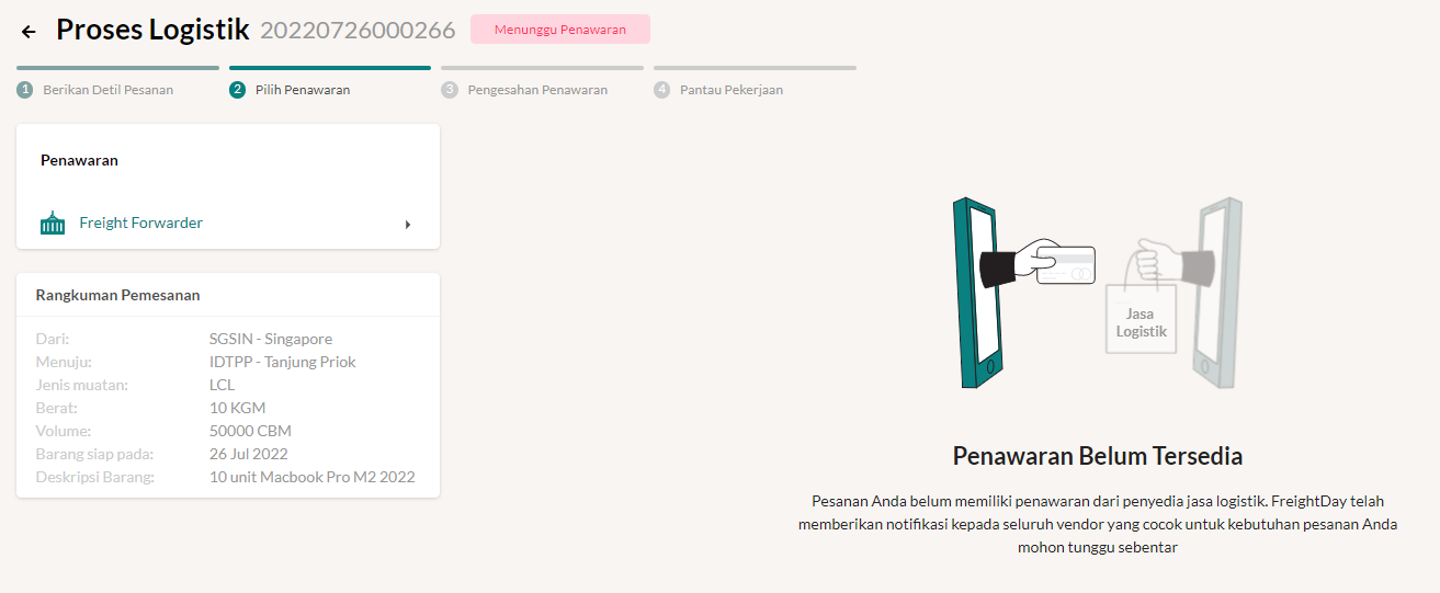 - Jika Anda sudah mengisi semua informasi, maka kebutuhan logistik Anda akan disebarkan ke FreightDay Network. Silahkan menunggu penawaran atas jasa logistik yang Anda masukan.