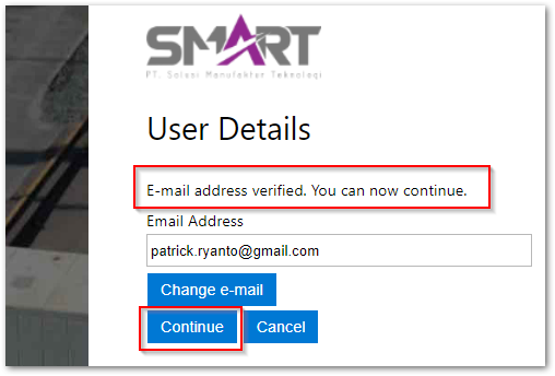 Pastikan sudah menerima pesan "E-mail address verified. You can now continue." Kemudian klik Continue