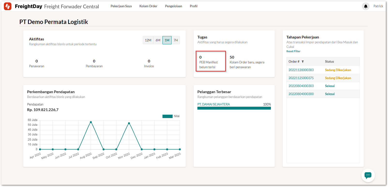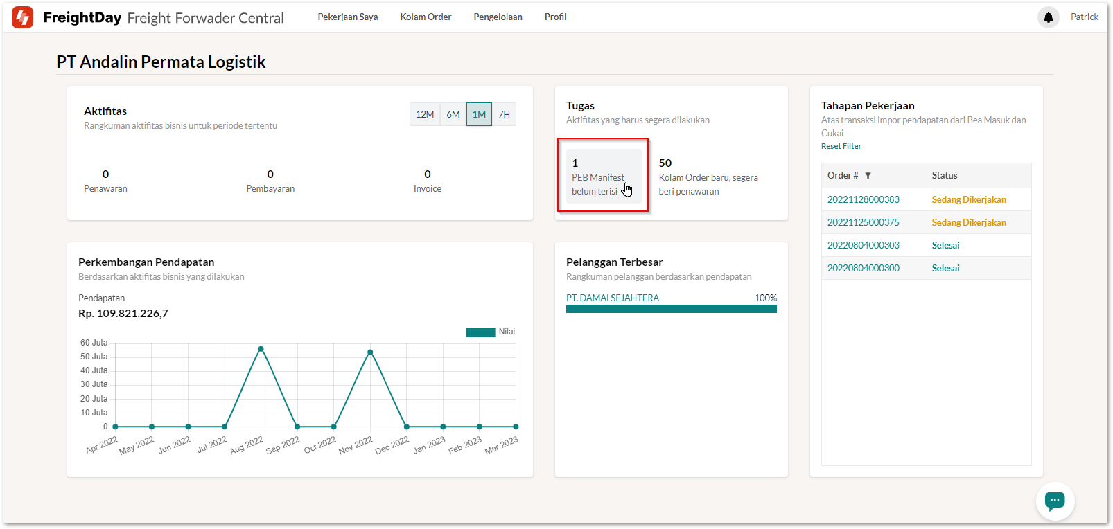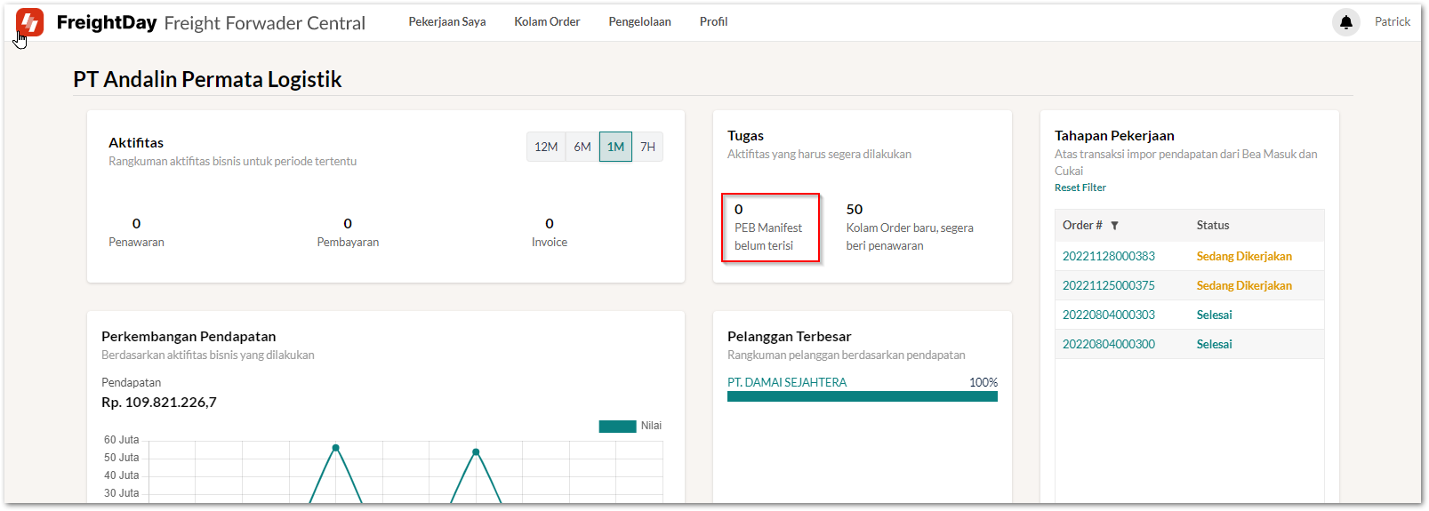 Sehingga jika Anda kembali ke dasbor (dengan cara klik logo FreightDay di pojok kiri atas) Pastikan PEB Manifest belum terisi selalu berinlai 0 (nol)