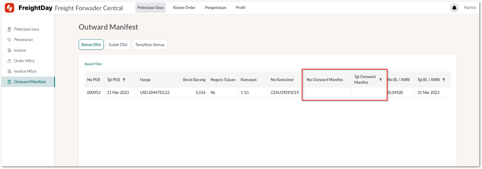 Setelah diklik akan muncul tampilan seperti di bawah Silahkan untuk mengisi nomor dan tanggal outward manifest pada tampilan ini